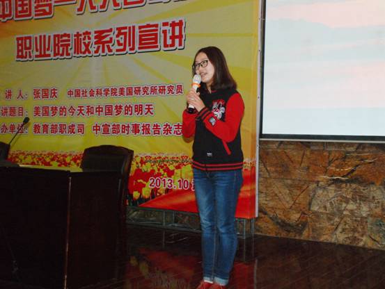 全國(guó)職業(yè)院校師生中國(guó)夢(mèng)主題演講比賽特等獎(jiǎng)獲得者、來(lái)自武漢船院11411班的李敏同學(xué)在宣講會(huì)上進(jìn)行了《為了深藍(lán)色的夢(mèng) 我們揚(yáng)帆起航》的熱場(chǎng)演講,教育部職成司德育工作與職業(yè)指導(dǎo)處主任董振華在會(huì)上作了講話,介紹了“中國(guó)夢(mèng)——人人皆可成才”職業(yè)院校系列主題宣講活動(dòng)的背景,中國(guó)社會(huì)科學(xué)院美國(guó)研究所研究員、著名國(guó)際問(wèn)題專
