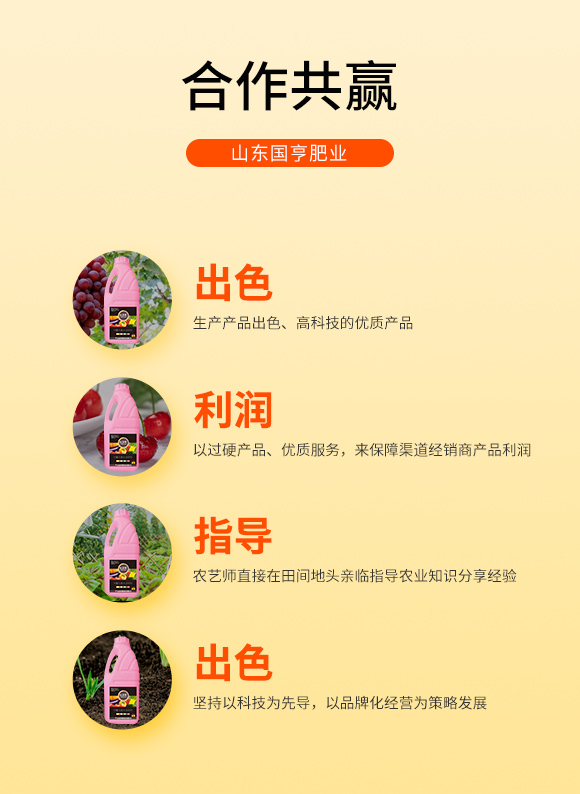 公司緊隨市場變化,關注肥料高新科技的發(fā)展趨勢,在國內市場銷售的同時,也積極出口國外貿易。公司現(xiàn)有“國亨”“ 田園壯”兩大品牌,依托強勢的服務和強大的品牌理念,公司在不斷發(fā)展壯大。一直以來,公司總是處于時代的前列,超前發(fā)展的思想,始終占領市場競爭的至高點。