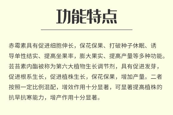 赤霉素具有促進細胞伸長,保花保果、打破種子休眠、誘導單性結(jié)實、提高坐果率,膨大果實、提高產(chǎn)量等多種功能。蕓苔素內(nèi)酯被稱為第六大植物生長調(diào)節(jié)劑,具有促進發(fā)芽,促進根系生長,促進植株生長,;ū9黾赢a(chǎn)量。二者按照一定比例混配,增效作用十分顯著,可顯著提高植株的抗旱抗寒能力,增產(chǎn)作用十分顯著。