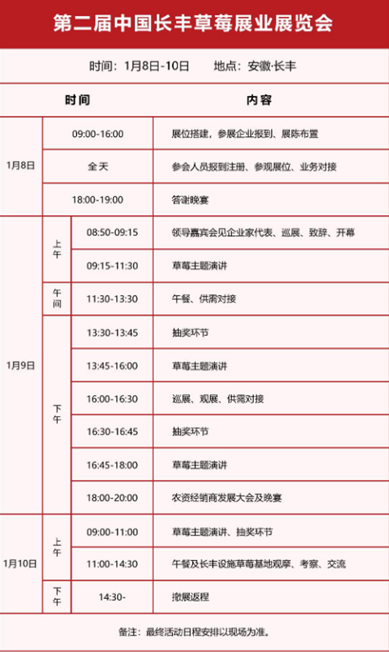 以上就是2025長豐草莓展日程安排的簡單安排,舉辦地長豐是全國的草莓種植基地被譽(yù)為“草莓之都”,種植面積達(dá)21萬畝,種植戶8萬多戶,連續(xù)多年被園藝學(xué)會(huì)草莓分會(huì)授予“全國設(shè)施草莓大縣”。